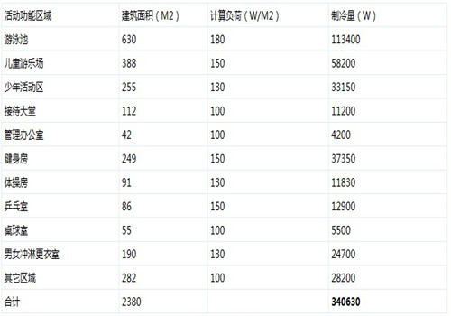 经设计计算,选用了美标公司的特灵(Trane)品牌koolman系列机组,型号为CGAR-0750,制冷量19.5Kw。单位面积制冷量达到每平方米280W,完全适应壁球场层高空间大及运动场所发热大的特点。 此热泵机组有两个压缩机,在低负荷时可单机运行。使用中,除春秋两季季节交替时需转换冷暖开关外,其余时间全自动运行。通过机组上的微电脑控制器,还可以适当调节冷热水控制温度以适应实际使用需要。 机组安装在地下一层停车场偏僻处,系统最高点安装了膨胀水箱。而壁球场内配置四台高静压风机盘管,由室内三速温控开关控制风机盘管的水流电磁阀的开闭,达到室温自动控制的目的。为了排除壁球场内的污浊空气,另接一路新风口向壁球场内送入适量新风。此项空调工程承包价为5万元。 从实际使用情况来看由于活动人员不多,壁球场空调经常处于停用状态。但并未出现原装修承包商所担心的枫木开裂等损坏现象。从节能方面来讲,热泵机组压缩机虽可在低负荷时自动停机,但水泵却是24小时一直运转,非常浪费。 现在看来,单独配置一台热泵机组不太合理。如果当初没有轻信承包商的24小时恒温的夸张要求,而是从俱乐部主空调系统接入空调,既能满足使用要求,也可省去一台热泵机组的费用,使用时还可灵活控制风机盘管运行,将更加节能。 二.俱乐部主空调通风系统 1.冷气机组系统 首先,空调负荷测算如下