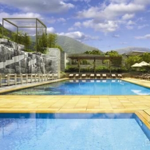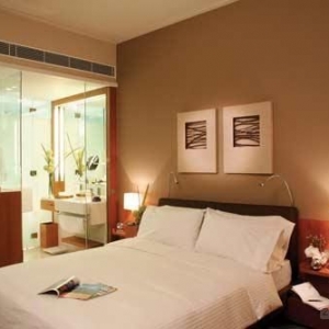 酒店客房 人字形排列的客房,紧紧相扣,发亮的房间门牌放在转角处,让客人更容易办认,加上走廊调暗的灯光及层层递进的天花,层次分明。 特厚的地板和墙身、全面隔音的房门及双层或三层隔音玻璃窗幕,为住客带来无干扰的宁静空间。 而配合窗外的环境,面向山景的客房以绿色为主调,面向泳池的客房则以喝色为主色。 开放式浴室以木材、玻璃及不锈钢镜面为主要材料,加强空间感,利用玻璃柱分隔浴室与寝室。部份客房的浴室,以玻璃分隔更显时尚风格,住客亦可选择将浴室趟门关上,享受多一点私人空间。