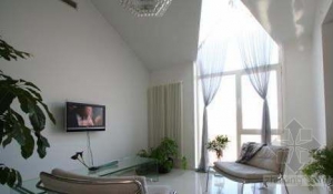 除了深红色的木地板和木色橱柜,白色是房间的主要色调,窗帘、沙发以及白色的地面都拉近了人和自然的距离。玻璃茶几,既通透明亮,又简约美观,富有现代感。主人从国外带回的花瓶,晶莹剔透,花瓶里的二枝紫色百合,更象轻盈的仙子飘临人世。带有生命气息的绿色的植物点缀在各个角落,另室内变得空灵而高雅。简素的物体和天然之材所营造的室内空间,使人的心境平和与安祥,超然物外。在这纯自然、高简素的色调中,展现出的是一种朴素、简约之美。 藕荷色的长方布艺沙发,坡屋顶和天窗以及落地窗,都在宣告着空间的广阔和空旷。绿植跃然其中,大气中不乏灵动。