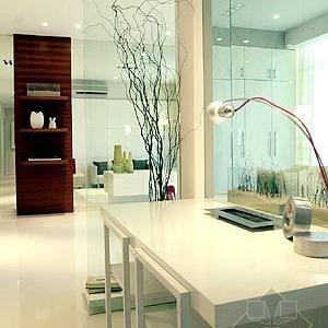 这个小茶几与客房外的书桌采用同一材料和色调,中间以一道玻璃隔开,感觉更有层次美。 说到这个客房,由于发展商允许买主选择是否要扩大客房,还是要利用客房外的空间作为其他用途,所以设计师便将这个客房外的空间布置成一个阅读空间,放置一张书桌。