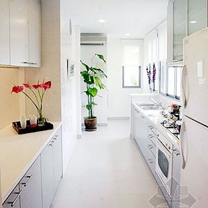 巧妙地利用质感,间中穿插强色彩,让白色调的房子不显得空白、单调,反而展现亮丽的视觉效果。 长形的厨房装置了许多橱柜,但光线充裕的厨房丝毫没有因此而有任何压迫感。