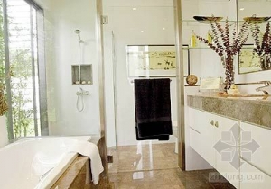 度假屋式的浴室,宽敞亮丽,让忙碌的现代人回到家中,享受沐浴时,能真正松懈身心。 一踏进这间浴室便被左边整排落地玻璃所吸引,这个设计让整间浴室显得格外亮丽,不但光线充裕,空气也更流通。