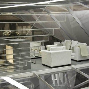 “麦迪逊大道Doll House”是Rozmiarek想出来作为未来概念之家和现代城市生活的需要,同时解决了空间的使用和重要性。Doll House将继续展览在Calvin Klein的旗舰店,经过的路人无一不驻足停留片刻。此外,纽约市的大幅照片现在也安装在橱窗中作为背景。Doll House这所时尚的住宅跨越4层,其中包括园林城市的钢制屋顶,压克力片,和4股有弹性的氨纶。这个1000磅的优雅结构表面上看上去像漂浮在纽约市街道上方,因为四个钢制连接件。褐色地毯上有细细的白色轨迹,这半透明巨大的UFO仿佛凭空现身,两边的街景,气势恢宏。里头白色螺旋式台阶将空间分隔为两层:楼下是起居室,温暖的壁炉,线条简练的白色沙发,狭长的褐色吧台;楼上则是更衣室和卧室。所有衣服家具是将CK男女设计师Italo Zucchelli, Francisco Costa和家具设计师Amy Mellen设计的2009年系列按实物缩小比例,浑然一体,充分体现了“Calvin Klein”的现代简约风格。