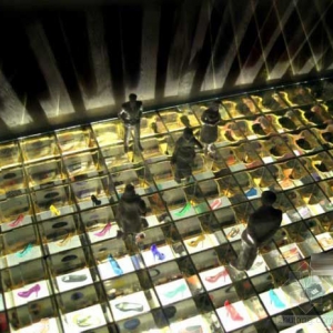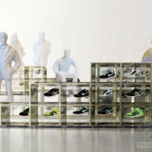 Visiondivision接到委托为位于马达加斯加岛国以东的留尼汪岛的本地皮鞋品牌mangrolia chausseures设计鞋店。作为旗舰店,店内的鞋子库存量是惊人的,委托方希望Visiondivisio的设计能在适应鞋店基本使用的同时也解决店里所有鞋子的存储问题。于是他们开发了一种鞋盒,使得存储量得以成倍增加,而且它几乎可以任何形式的堆积,并根据需求创造各种商店布局。这种鞋盒由有机玻璃制作,轻巧美观,如乐高积木般好用。透明的有机玻璃使得鞋盒看起来如果冰块一般。商店可以通过堆积“积木”设置好游客在店内的循环路线,从入口一直到出口收银处。