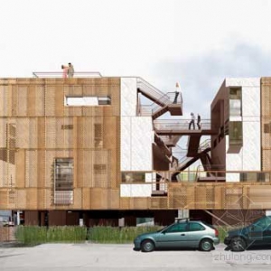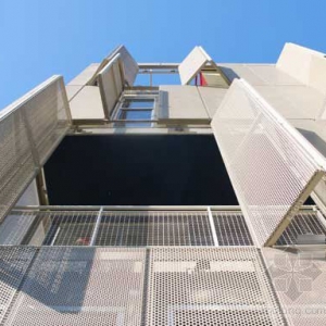 Push+Scarpa建筑事务所设计的切罗基公寓位于洛杉矶,是加州南部第一个符合LEED黄金认证的混合用多户家庭建筑。公寓有五层楼,12个套房位于二楼到四楼,一楼是一个28平方米的零售商店,同时还有一个地下车库和屋顶花园。 建筑的独特之处在于它的外立面看起来像是一个有孔的金属结构。不过,这个“屏障”式外表面有着手风琴式的百叶窗结构。住户打开或关上百叶窗,使建筑的正面形成了一种不断变化的特征。 建筑的开发对于切罗基录音室,MGM Studios和那些从Frank Sinatra到David Bowie到Dave Matthews现场录音师的那段音乐和好莱坞历史表示了敬意。建筑形状和功能也是对于所在地环境和文化北京的一种表达。