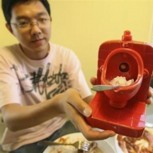 2008年6月29日,在浙江省杭州的一家以卫生间为主题的餐厅,一位食客正展示微型马桶中的冰淇淋甜品。餐厅把马桶作为餐椅,餐具往往是一些微型浴缸和微型马桶。