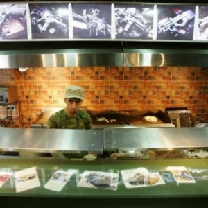 2008年6月27日,黎巴嫩贝鲁特“包子和枪支”快餐店里身穿军队T恤的厨师。该军事主题的餐厅位于黎巴嫩首都贝鲁特真主党控制的南部郊区。餐厅的厨师穿戴着军事装备,顾客坐在沙袋墙的后面。食物上方的标语写道“一个三明治可以杀了你!”
