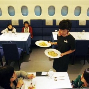 2009年1月22日,在A380飞机的“机舱”中,打扮成空姐的一名女服务员在为顾客提供服务。台北的一家餐厅的名字命名为巨型空中客机,一位台北的企业家自2008年11月开始经营这种服务。经过包装的,餐厅有同航行的客机几乎一样的外观和功能,销售全套高端西餐,有时还用塑料托盘。