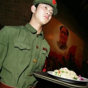 2006年4月7日,北京的一家“红色经典餐厅”,一位打扮成红卫兵模样的服务员走过已故毛泽东主席的肖像。“红色经典”是一家基于发生在1966年至1976年中国文化大革命的主题餐厅。餐厅装饰着那时期的海报,服务员打扮成当时的红卫兵,表演文革时期的歌曲和舞蹈。