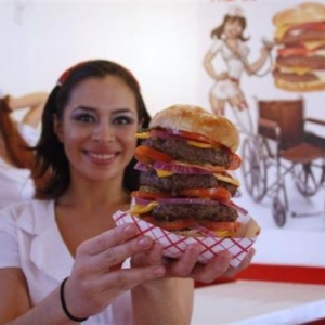 2009年6月17日,扮成护士的服务员展示招牌食物,超大“心脏搭桥汉堡”。在美国的亚利桑那州有一家医院主题餐厅,叫“心脏病烧烤”店,到这里的顾客都被称为“患者”,功能表叫“药方”,为你服务的则是穿超短裙,长丝袜,戴护士帽,身材火辣的女招待。
