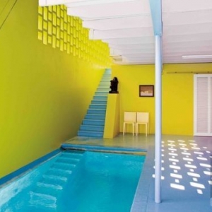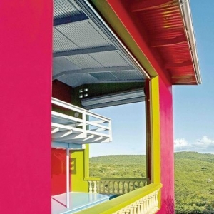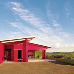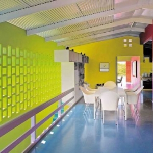 这幢躺在山坡上的混凝土建筑被洒上了嫩绿色、淡黄色、艳红色、深蓝色,流淌着生命的色彩让房子显得俏皮又可人,你甚至能在它身上寻找到当地热带植物的色彩。也正因如此,尽管它有着鲜亮的对比色,却和谐地融入了周围的景致里,毫不突兀。