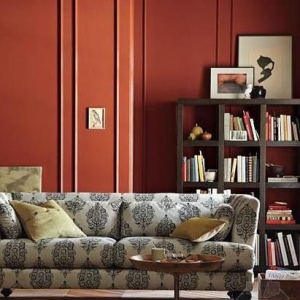 整体效果:深红色客厅里,长沙发、黑色休闲椅、书架等元素,已经为客厅增加了太多“重量”。小巧的托盘茶几不仅让空间显得开阔,设计上的轻便灵巧,也让客厅减重不少。 |