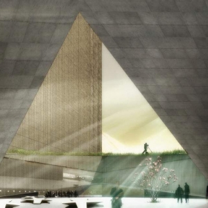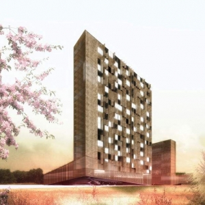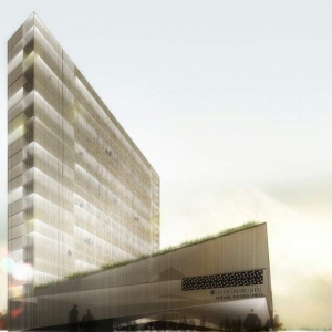 建筑在垂直方向上延伸,正方形的基座承载着两座建筑----酒店中心和住宅区,并创建了整体结构。坡道做为主要交通通道围绕庭院设计,是广场中心偏离轴线的设计。 入口大厅是一个中庭,为公共和私人空间提供了门槛。中庭一边是商业中心,另一边规划设置接待、水疗和健身中心并与酒店相连。