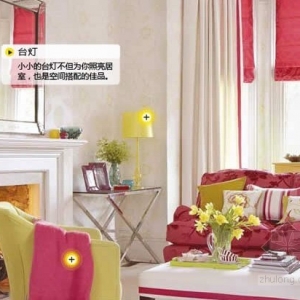客厅: 搭配元素:粉色毛毯+黄色台灯 墙壁的颜色为稍带黄色的乳白色,台灯、单人沙发颜色为黄色,粉红色和黄色,这种配合会创造出舒适明亮的感觉,塑造一种活泼气氛。这种色调的搭配可以用在朝北较冷的房间和采光较差的房间,用墙壁的颜色和家居的配色来让人感觉温度有所提高。