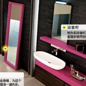 浴室: 搭配元素:粉色全身镜+粉色浴室柜 富有女性气质的玫色永远是浪漫、梦幻的象征,用在家里能带给人非常柔美的感受。要想把如此魅力十足的颜色用在家里,着实需要一些技巧和魅力!如果你刚开始尝试给居室增添色彩,不妨选浅淡一点的色调,这样能让大多数人都接受并喜欢上它。