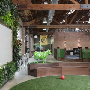 创意十足牛奶公司办公室装修设计,这是一家牛奶公司的办公室。办公室装修设计褐色的主色调搭配着绿色的点缀,仿佛草地一般清新原生态,木质房子桌椅与砖墙十分原始自然,奶牛的模型与墙上的奶瓶体现了企业的核心,创意十足。