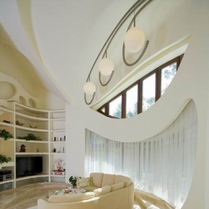 这是一座位于波兰华沙的现代住宅,曲线化的设计,非常独特住宅。现代住宅室内设计地面层的设计主要是作为一个开放式的休息区。在客厅的宽敞明亮气氛,采用自然的色彩和光泽的材料,包括镜子,大理石,花岗岩,光从大窗户照进来,人工照明点分布在许多地方。现代住宅最有趣的功能之一是在客厅的窗口 - 高度达到照亮不仅地面的二楼,也有夹层玻璃的窗台。迷人的栏杆是一个聪明的组合,石膏板,钢架,柱的设计。一座具有审美价值的住宅。
