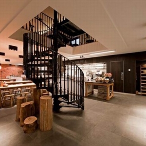 这是一间位于英国的餐厅室内装修设计,一个全新的,功能齐全的,现代化的设计,餐厅室内装修非常惊艳。一个古老的裸露的砖墙设计,老旧的材料,一种历史的年代感。螺旋钢之楼梯,圆形大吊灯,一个大胆巧妙的设计。
