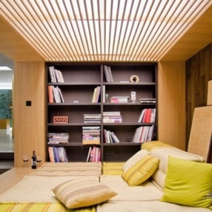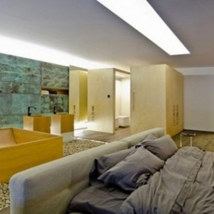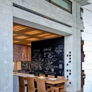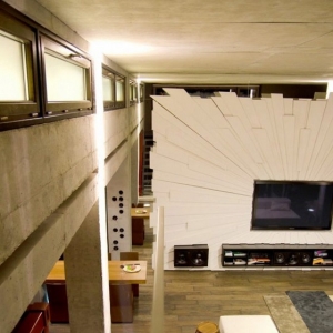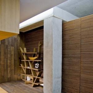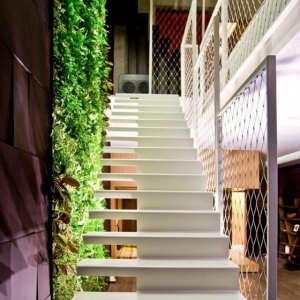 这个独特混搭Loft住宅室内设计很好地体现了多材料和质感的混合,在这里,不同的形状、颜色、材料和质感配合得天衣无缝,形成这处独有的舒适loft住宅。独特混搭Loft室内设计本来属于工业风格的建筑,共有三层,设计师在其中融入了非同一般的装饰元素。在主要的生活区内,我们可以看到木材、混凝土、玻璃、金属和裸露的砖块,在独特的细节装点下更加凸显各自的特色。不同的风格在这里猛烈的融合、碰撞。客厅和餐厅里有一面绿色植物体墙壁,使室内充满生机,上方是一个小的平台。电视墙是一面带有射线纹路的墙壁,客厅里还有许多类似的迷人细节,排列模式模仿盲点的酒架等等,都体现了别样的格调。