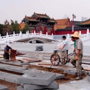 沈阳故宫南门外的三座汉白玉材质的单孔金水桥基本完工。