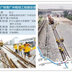 大沥贵广南广铁路工地,机车将两条500米长的钢轨铺在地面上,工人们正在协力控制钢轨的落地位置。 广州枢纽工程的铺轨基地于去年12月建成,所有500米长轨均由广深线东莞市红海焊轨厂先将100米无孔轨焊成500米长轨条,再运至铺轨基地,然后转运至铺轨现场。据了解,500米长轨直铺大大减少了线路钢轨焊接接头数量,有效减少轮轨冲击、振动,提高了轨道铺设精度,保持了轨道的持续平顺,具有铺设速度快、安全性能好等特点。 据中铁贵广南广铁路枢纽指挥长王海杰介绍,如果不受天气、材料供应和施工配合影响,按照每天铺设长轨6公里施工能力,预计9月中旬可完成长轨铺设工作,进入下道工序。按照施工计划,11月1日开始联调联试,12月26日试营运。 贵广南广铁路广州枢纽因其位置的特殊性,是全线最晚开工的区段,也是全线最后进入铺轨的区段,铺轨共205公里。此前,南广铁路广西段已经开通运营。 南广(南宁至广州)高铁跨广西、广东两省区,始于广西的南宁站,经贵港、梧州,广东省云浮、肇庆、佛山至广州的广州南站,全长577.1公里。贵广(贵阳至广州)高铁自贵州贵阳北站起,经贵州黔南布依族苗族自治州,广西桂林、贺州、广东肇庆、佛山至广州的广州南站,全长857公里。 贵广、南广两条铁路自肇庆东站相交后,四线并行进入广州南站。中铁二十五局集团承建的贵广南广铁路广州枢纽及相关工程是新建贵广、南广铁路四线并行引入广州南站以及广州枢纽的相关改造工程,途经佛山和广州,经三眼桥后分别引入广州南站和广州站,涉及两条既有线路——广茂线、京广上行线的改建,以及改建既有的广州站、广州西站、三眼桥站、奇槎站。  贵广南广铁路线路图