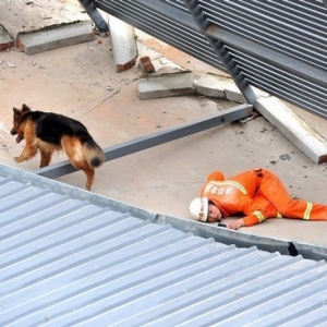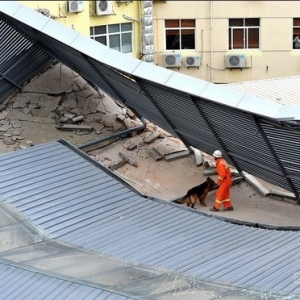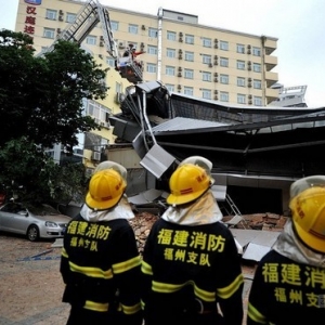 20日16时许,福州市五一中路状元巷26号一幢正在装修的旧建筑三层楼房突然发生坍塌。该建筑物属70年代修建,混合结构,占地面积250平方米。消防人员第一时间赶赴现场救援。图为消防队员现场紧急救援。