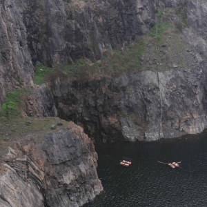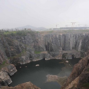 “深坑酒店”——世茂深坑酒店高度约70米,共19层,分为坑外和坑内两部分,坑外为3层;坑内16层,其中有2层在水下,包含酒店客房、会议、餐饮层。图为在上海松江即将开建的“深坑酒店”的废石坑。