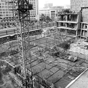 透过被人砸烂的窗玻璃,可以看到建筑工地上的忙碌景象。