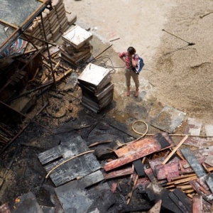 昨日,湖南省长沙市香樟路上一小区附近的建筑工地发生火灾,冒出滚滚浓烟,高达数十米,十三层楼高。在院子里见到一堆烧得黑漆漆的木材和树木。院子里摆放着很多墙砖、板材、水泥、钢管、沙子等装修材料,木条和板材已被烧得黑了。现场工人介绍,起火的是那些黑色的泡沫,木材就在旁边,也被烧着了,冒出很浓的黑烟。住在2栋13楼的张女士说,当时看到烟非常大,就立马把窗户关了起来。因为在施工,工人直接用水管里的水浇灭了大火。