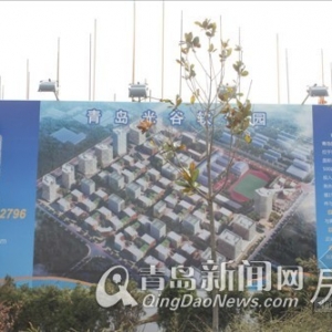 青岛光谷软件园围挡 整个青岛光谷软件园园区四周由市政道路围合,呈近正方形,东西长约640米,南北长约570米。其中用地东北角附近有一块约67亩的用地为黄岛第十中学学校用地。项目用地周边道路中,西侧以昆仑山路为城市主干道,红线宽度为50米,其余三条道路为城市次干道,红线宽度均为35米,这也是武汉光谷进入青岛市场的第一个项目。