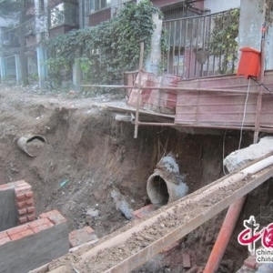 北京市通州梨园洼子1号楼旁不到2米处被挖5.2米深沟 中国网9月20日讯 今日网友爆料,北京市通州梨园洼子1号楼旁不到2米处被挖5.2米深沟,居民认为会导致地基动摇,多次与施工方商量未果。 记者连线洼子楼住户谭小姐了解详细情况。她告诉记者,这栋居民楼原是通州区建筑机械施工部的单位楼,属于通州区建筑集团总公司,不过原单位已经解体了。“施工队并没有提前跟我们说,挖沟是为了给旁边铜牛针织厂的小区埋管道用的,排水、引水、热力管道都从这里走,9月13号那天突然断电,我们才知道是施工队把电线挖断了。”