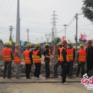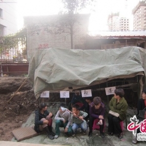 施工单位请来的人 就在记者连线谭小姐时,听到电话筒传来人吵闹的嘈杂声,“他们每天都来,说每天给100块钱,第一天来了20几个人,第二天来了60多个,后来说要过来两百多人,他们一来我们就给110打电话。”谭小姐告诉记者。“我们这栋楼总共有84户,目前已经没有人在楼里住了,担心随时楼会有垮塌的危险,年纪大的就投亲靠友,男的就住帐篷,我们为了不让施工单位继续施工,24小时搭轮流守着。”