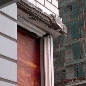 阳台被砸坏处用木板暂时支撑着