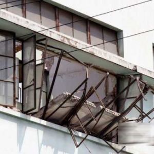 房顶坍塌后砸向窗户,窗框也变形脱落。