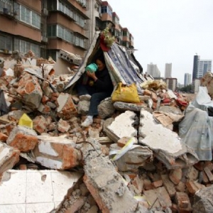 2010年10月25日,郑州多人被扔荒郊泥沟,返家房屋夷为平地。图为被扔到樱桃沟的贾灵敏回到家发现家已成为废墟,随即在废墟上打起一个小窝棚,自己吃住在这里。