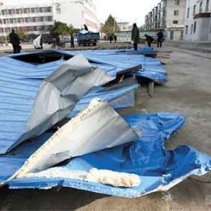 房顶彩钢板被风刮落 砸伤14小学生 昨日10时17分许,一阵大风将德惠市第六小学的教学楼房顶彩钢板吹翻掉落,造成14名学生受伤。当天德惠市西南风,风力3至4级。 祸从天降 1、约400平方米彩钢板掉到地上 昨日12时50分,20多名德惠市民聚集在德惠市第六小学门前向院内张望。学校院内有两栋4层教学楼,分别位于操场的东侧和南侧。南侧楼前平放着一块约400平方米的彩钢板,连接着松木的房梁和垫料,地面上和屋顶上有10多名工人正在清理回收彩钢板和木料,拆卸下来的彩钢板已经装满了半车。 临近下午,很多小学生返回学校准备上课。为了防止被地上的杂物刮伤,10多名老师和小学生组成人墙,防止学生靠近。 “这风太邪乎了!把房顶都刮掉了,以前从来没看见过。”一位工人说,他们是来清理校园的。15时左右,现场被清理干净。 营救 20多名老师合力救学生 “我从教几十年,还没遇到过这么危险的情况呢!”昨天14时许,第六小学副校长宋晓辉抹了一把头上的汗说。 从事发到14时,学校的30多名教职员工都忙着营救受伤学生,没有时间吃午饭。 宋晓辉说,事情发生在第三节和第四节课的课间,准确时间应该是10时17分,还差3分钟就上课了。当时很多学生在操场上活动,不知出了什么情况,南侧老教学楼楼顶的防水彩钢板整个儿掉落下来,将十几名学生砸在下面。其他孩子大都惊慌地跑进了教学楼,还有一些吓得在原地无法动弹。 “学校共有100余名教职员工,当时在操场上的大约有20多人,这些教职员工立即自发组织起来营救学生。我赶到现场的时候,看到同志们正合力掀起彩钢板,被砸到底下的几个孩子都爬了出来,有的爬不动了,有老师钻进去给拽了出来。他们中女老师居多,但所有的人都奋力营救学生,我很感动,大家能这样对学生,对得起人民教师这个名字!”宋晓辉说。 为确认彩钢板下面是否还有学生,他们报了110和119请求支援。学校发动第四节没有课的老师和后勤员工,送受伤学生乘坐急救车去医院,一些轻微伤的学生则由老师打车送到医院。 回忆 大风吹得睁不开眼睛 南侧教学楼内上课的都是3到5年级的学生,昨天下午仍然正常上课,4楼教室的屋顶没有受到损坏。 “当时太吓人了,房盖整个掉下来。”5年级的一位学生说,当时是第三节课下课休息时间,同学们正在排队准备进屋上第四节课。“一阵大风吹得人睁不开眼睛,突然房盖就飘了下来。下落的速度不快,可还是砸到了楼下排队的同学。”据学生介绍,很多同学都吓哭了。各班老师赶紧把学生带回教室,然后回去救人。随后,四五辆救护车开进了学校,受伤的学生很快被送到了医院。 记者在德惠市气象部门了解到,昨天,德惠市风向是西南风,风力是3至4级,未来三天全都如此。 记者调查 2、拆除女儿墙导致房盖掀翻 施工安全问题将进行调查 “楼房是从西南边先掀起来的!”张先生家开办的补习班距离出事的教学楼只有一墙之隔,他介绍,昨日10时许,突然刮起一阵大风,补习班的门窗被吹得“咣咣”直响,这时他看见学校教学楼屋顶上的彩钢板一点点掀了起来,发生巨大的撕裂声,转眼间彩钢板不见了,只剩下了东侧四五米长的一段。 张先生介绍,教学楼屋顶曾经有一圈半米高的女儿墙,可是上周南侧的女儿墙被维修工人拆掉,在边缘处又钉上一层彩钢板,“如果不拆女儿墙,这房顶肯定没事。” 记者看到,女儿墙被拆除后,缺口处露出了红砖。安装后的彩钢板伸出屋顶20多厘米,但彩钢板的下端并没有像周围楼房一样用角铁固定,彩钢板下面可以清晰地看见缝隙。附近居民介绍,昨天上午因为风大,施工队担心施工不安全,所以没有施工,否则肯定会造成人员伤亡。 记者调查发现,学校操场的西侧和北侧都是些平房和低矮建筑,学校西侧形成一处风口。昨天正好吹西南风,正是大风吹进缝隙,最终才把房盖掀翻。