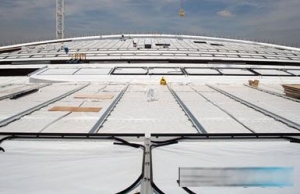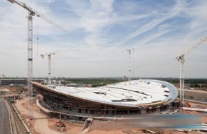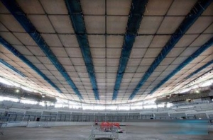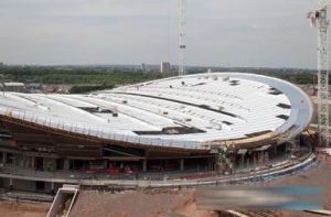 屋顶安装完毕后,内部工程可继续进行,秋季将安装自行车赛道。目前这座6000席场馆的照明和播音系统、扶手和栏杆正在安装当中。 Hopkins是在2007年在设计竞赛后受到聘任的。施工从去年3月份开始。