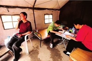 郭大妈夫妇在帐篷内,陪着孙子写作业