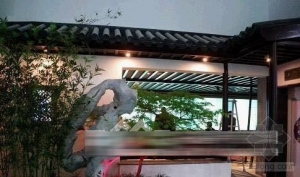 二楼墙上挂着的卷轴画实为LED显示屏 据介绍,上海世博会城市最佳实践区苏州展馆位于浦西世博园城市最佳实践区中部系列展馆B1馆内,为二层结构布局,建筑面积488平方米,历经80多天的连续作业,近日该展馆正式竣工,目前正在实施扫尾工作。 上海世博会城市最佳实践区苏州展馆的主题为“古城保护与更新”,设计者巧妙地用代表苏州元素的实物将这一概念性的主题完美地演绎。一走进苏州展馆,眼前就出现一个苏州小庭院:古井、假山、太湖石、竹子,仿佛走进了一户苏州人家。而旁边一处供残障人士用的电梯也没有冷冰冰的金属感,电梯门刷成白色,中间还贴着一幅桃花坞木刻年画“一团和气”。电梯的右侧,是一座立体石拱古桥,古桥左侧墙上是一幅大型水墨画,淡水彩的色调勾勒出苏州的小桥流水人家,水墨画最高处达7米,顺着古桥的石阶拾级而上,人仿佛置身画中。