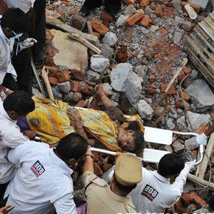 2月5日,在印度海德拉巴,救援人员将遇难者抬离倒塌建筑废墟。