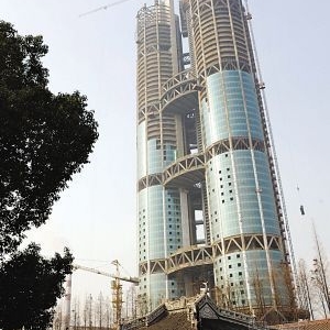 一座328米的高楼将挺立在华西村的土地上。 目前,这座高度在中国排名第8,被称作“空中华西村”的摩天大楼正在紧张建设中,60层主楼已经封顶。按计划,20年前就已经住进别墅的华西村民们,即将完成居住质量的又一次提升——住进五星级的摩天大楼。然而,在这座摩天大楼不断增高的过程中,争议声四起,面子工程?拉大“大华西”中心村和周边村的差距?华西村究竟要干什么? 空中华西村:“五星”标准 “我们要建一个空中华西村!”吴仁宝说。 吴仁宝,前任华西村老书记。他并不张扬的声调里,显示出不可动摇的自信:“花20多个亿建一座楼,对我们来说不算什么。” 从2007年8月8日打下第一根桩至今,华西摩天大楼的工期正在按照筹备办公室墙上的进度表稳步推进。施工24小时不间断进行,每天至少有1000人奋战在摩天楼的建设现场。按计划,大楼必须在明年6月试运行,10月正式投入使用。 深圳帝王大厦的建造者,创造过“深圳速度”的中建二局,以10.6亿的要价成为摩天楼的承建方。玻璃外墙、水暖装修等工程,也被分包给同样在业界享有声誉的公司。 目前,摩天大楼初见规模——60层高的主楼已经封顶,三足鼎立,托起一个巨大的球体,5个空中花园,联通三足。 按照项目规划,“空中华西村”一共74层,地下两层,地上72层,其中主楼60层,球体和颈部12层。