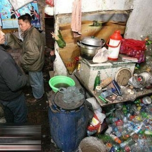 图:无奈的工人们为了维持生计,只能住在简陋的工棚里靠捡瓶子、收废品度日。