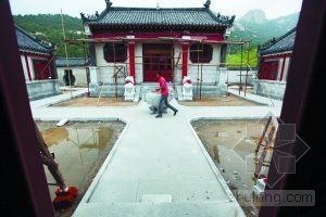 昨日,一名施工人员穿过祠堂。近日,山东烟台市人大常委会原常委李德海被指毁林建豪华墓和祠堂。