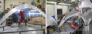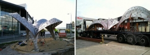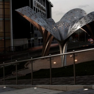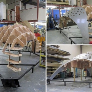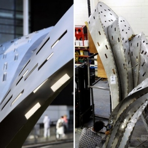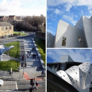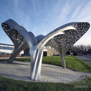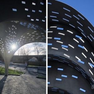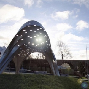Tonkin Liu建筑事务所为英格兰一座河滨市镇伯恩利设计建造了一座以“彩虹门”为意象的独特亭子。作为工业革命的受益者,伯恩利这座新兴工业城市曾因为充沛的降雨来补充河水而大力发展工业。在这种概念基础上,设计师们通过建筑元素向当地的经济历史致敬,并且引入以精密机械为代表的后工业时代。 在伯恩利学院的门前、三条大路的交汇点,这座满是孔隙的钢体以曲线勾勒出交通联系的形象。雨滴的敲打声在金属上回响,当雨水汇集成束从亭子上的凹槽流下时,嵌入在孔隙中的透镜将会捕捉阳光并将其打散为彩虹光谱并投影到地面上。暂且不谈光谱的多彩斑驳,建筑师们与Arup公司的工程师们还倡导一种称为“外壳花边”的结构系统——一种取形于自然并且通过对材料的最优化来构成轻量化且具有自我支持性的形式。通过整合数字制造技术和建模技术,以及加强海洋贝壳的分层几何层次,这个作品兼具曲线感与力量的波纹感,而这也减少了非承重层的材料使用。这使得这座亭子在拥有活力外表的情况下也具有高效的建造结构。
