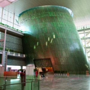 [BAIKE]首都博物馆新馆位于北京市复兴门外大街与白云路交叉口西南角,南侧、西侧为规划区间路,用地面积 2.4hm[SUP]2,地上5层,地下2层,建筑总高度约40m,总建筑面积约63390m[SUP]2。工程性质为大型综合性博物馆,建筑的设计使用年限为100年,建筑结构的安全等级为一级。首博新馆建成后将成为新世纪北京十大标志性建筑之一。 首博新馆地面以上平面呈长方形,长144m,宽65m,分为北侧的主展览楼、椭圆形展览楼、南侧的管理办公楼及东侧钢平台等几个部分。其中,主展览楼地上5层,楼面标高28.7m;椭圆形展览楼地面以上6层,以10∶3的斜率向北倾斜,在距±0.000标高约 10m处突出墙面,屋面结构标高39.5m;南侧的管理办公楼地上6层,屋面结构标高25.95m;东侧钢平台地上6层,顶层标高28.4m。 二、新技术应用与科技创新 1 、巨型现浇钢筋[BAIKE]混凝土椭圆斜筒体,利用覆膜胶合多层板拼成多面体拟合曲面体,以整体刚架作为支撑,单侧倾斜墙体通过内刚性排架拉顶,承受斜向结构施工中产生的水平荷载。通过采用掺加膨胀剂并控制其他外加剂的碱活性及含量指标优化混凝土配合比,提高了混凝土的耐久性。经查新为国内首创,达到国内领先水平,施工工法被评为国家级工法,为类似超高异型结构的施工提供了借鉴。 2、大型钢屋盖长168m、宽89m,主跨度56m,大跨度悬挑21m,与椭圆斜筒体相互交叉、结构复杂。采用了分段吊装、高空组拼的施工方法,布置综合脚手架的方案,使用“沙漏千斤顶”有效保证设计要求。通过对挠度变形机理的系统分析及多项研究论证与模拟试验,使[BAIKE]挠度变形精度控制在3mm以内。 3、14952m[SUP]2超大面积蜂窝铝板吊顶及21m超大跨度悬臂挑檐,采用抱箍节点板与主体钢梁及吊顶龙骨拴接的形式,减少荷载影响,吊顶平整度误差控制在4mm以内,经查新为国内首创,且被评为国家级工法。 4、7500m2大面积木质幕墙采用钢龙骨外挂安装工艺,节省时间,且装修效果良好,节省了工程成本。通过对板材特殊的加工处理,满足了耐候、防腐、防火和色差控制等质量要求。经查新为国内首创,施工工法被评为国家级工法。 5、椭圆斜筒体青铜板幕墙高48.2m、总面积4750m2,是国内首个最大面积的青铜板装饰幕墙。1m×3m的平行四边形薄壁双曲面单元铜板采用无龙骨安装技术,利用三维空间测量定位,板间[BAIKE]缝隙的安装精度为5mm,为相关规范的制定提供了参考,经查新为国内首创。 6、超大型[BAIKE]不锈钢屋面达15246m2,由金属屋面板、自动开启天窗、虹吸排水系统组成。屋面板强度高、重量轻、抗腐蚀、耐久性高,在温度变化下可自由滑动、伸缩。 7、屋面太阳能光伏发电系统总峰值功率为300kw,将成为国内最大的太阳能光伏发电并网工程之一。智能化照明控制系统在节能的同时实现动态、艺术的环境氛围调节。精密空调系统确保文物展厅及库区内常年恒温22℃、恒湿50%。 8、“高难度异型结构施工与精装饰技术研究与应用”通过北京市建委专家组的的科技成果鉴定,鉴定委员会认为该成果具有很好的推广价值,达到国际先进水平。 9、屋面采用虹吸雨水排水系统。首博新馆屋盖面积大,屋面坡度小,室内空间高大,传统的重力式雨水系统无法有效解决屋面排水问题。在设计中采用虹吸雨水排水系统,较好地解决了建筑空间与给排水专业的矛盾。 10、文物库房、文物修复中心、善本书库等设气体灭火系统。由于博物馆的安全性要求,不允许在文物库内部设置机房与设备间,此外文物储藏、珍品库房不允许出现水渍,在设计中首次采用了新引进的美国技术——备压式FM200系统,很好地解决了近10000m[SUP]2的藏品库和几千平方米的精品展厅内的消防问题。 三、获奖单位 北京建工集团有限责任公司总承包部 首都博物馆新馆建设工程业主委员会 中国建筑设计研究院 北京市机械施工有限公司 北京市建筑工程装饰公司 |