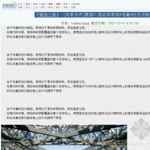 简介: 近日一篇题为“震惊!奥运体育场‘鸟巢’白天不能使用”的帖子经过网友转载,在各大论坛广为流传。 帖子的正文这样写道:由于鸟巢的设计缺陷,使用过于复杂的钢结构,而且高度太低。在晴天的时候,钢结构的 ...