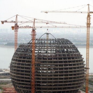 2007年8月21日,位于杭州钱江新城的杭州国际会议中心已见雏形,主楼钢结构完成封顶。由浙江长城建设集团总承建的国际会议中心由地面以上19层圆球形主楼和两层群房组成,其中,圆球的直径达到85米。该工程既是钱江新城的标志性建筑、杭州首家超五星级酒店,也是目前我省最大的钢结构公共建筑工程。建成后的杭州国际会议中心具有会议、展示、住宿、餐饮等多种功能,它与半月形银色基调的大剧院,宛如一对姐妹建筑,一日一月、一金一银,在荡漾碧波的钱塘江旁相映成辉,展示了“日月同辉”的设计理念。