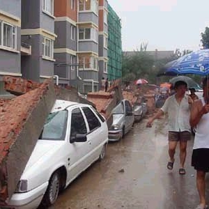 事发地点位于崇文区的南水关胡同,倒塌的围墙属于铁路宿舍居民回迁楼,工程已基本完工只差入住。据目击者王先生称,下午4点半,天儿正下着大雨,就听“轰”的一声,半面墙瞬间倒了下来。幸好当时路上没有行人,车里也没有人,否则后果不堪设想。 记者在现场看到,一条近百米长的砖墙,由西向东倒了约50米。停在墙外的捷达、富康、夏利,还有一辆工程抢险车共8车受重创,其中6辆汽车遭受了“灭顶之灾”,砖墙将车顶棚完全压塌,甚至驾驶室里也塞满了红砖;另两辆伤势相对较轻,只是车侧身有几道划痕。由于地基已有半车高,所以围墙倒塌后正好砸向停在旁边的车顶。 记者注意到,受损最严重的是一辆宝石绿的夏利车。整个车身被压扁,前车窗和侧面的车窗玻璃已完全粉碎,车轮不堪重压,四个轮子全瘪,一侧的车门被压开,车内物品散落一地。车主何先生看着面目全非的爱车,心疼地说:“刚刚买了一个月,就被砸成这样。尽管上了全险,但还不知道保险公司能赔多少呢。” 为了防止再度倒塌,17点50分左右,施工单位组织了近百名民工将西侧围墙推倒。同时施工方将车主组织到一起,研究善后事宜。据车主何先生说,施工方承诺保险公司不予赔付的损失,他们将全部赔偿。 据附近群众分析围墙倒塌的原因有两个:一是大雨使围墙的地基疏松,致使围墙倒塌;二是围墙里面堆积的泥土吃水过多,压迫墙体使其坍塌。至于倒塌的具体原因,区建委的一位不愿意透露姓名的工作人员表示:“到目前为止,在鉴定结果出来之前还不能够判断倒塌原因,但肯定与这几天的降雨有一定关系。” 截至记者19点左右离开时,太平洋保险公司和其他几家保险公司的理赔人员陆续到达现场,处理相关赔偿事宜。 |