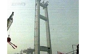 1钢索横躺在45米深的江底 过江牵引索跨过215米高塔 8:00,南塔顶部记者跟随工作人员乘升降机来到215米高的塔顶。高耸入云的南塔与对岸的北塔遥遥相对,两座巨塔庞大的身躯将托举重达2.1万吨的过江钢缆和2.3万吨的桥面结构。而当日安装的牵引索将为未来的托举打下基础。 要架设的两条各重18吨的过江牵引索将跨过两座高塔,由牵引船从南岸沿江底铺设到北岸,然后两边的卷扬机同时启动,将横躺在45米深江底的钢索绷出水面,呈马鞍形紧固至距江面65米的高空中。 这时,一阵风吹来,记者感到塔身在轻轻地晃动着,心中非常惊慌。工作人员却一个个若无其事,技术员小梅告诉记者:一般的高空建筑都允许存在一定的晃动,这点小动静,是远远低于允许的晃动范围的,绝对可以放心。 2神州第一锚上架设卷扬机 放索驳船承载牵引索起航 8:30,南锚碇作为悬索桥的主要受力部位,锚碇是整个牵引工程的“命根子”。在这根即将承受6.8万吨拉力的“神州第一锚”上,也架设了一个卷扬机,但远比塔顶的那个庞大。 南锚碇现场办公室主任程建新告诉记者,这是专为润扬大桥订做的25吨智能化卷扬机,可以自动测重测长,在国内还很少见。几个小时之后,长2900米、近18吨重的牵引索将通过它绞紧、收缩。工作人员们盯着卷扬机的电脑屏幕,紧张而熟练地做着最后的准备工作。 9:00,南塔脚下大桥现场总指挥吴胜东手持话筒,庄重沉稳地大声命令:“我宣布,润扬大桥过江牵引索开始架设。”话音刚落,南塔吊车巨臂上悬挂的两串10万响鞭炮同时炸响。开工仪式现场云集的众人脸上都露出了兴奋的笑容,大家不约而同地鼓起掌来。 而几乎在同时,已经登上守候多时的放索驳船的现场总指挥沈良成一声令下,承载着2300米牵引索的驳船正式起航。在未来的3个小时里,它将作为整个工程的指挥中心,行驶在浩淼的长江上。 3施工江段临时实行封航 两岸百姓争看巨龙过江 9:10,指挥船10分钟过去了,驳船已经在江面前进了250米,几名工人捧着钢索,慢慢将它放入水中。突然,江中水流变急,速度加快,冲得钢索左摇右晃。工人们立刻按预定方案,将钢葫芦放入江中钢索的两侧,用来稳定钢索。 很快,一切都按照计划继续进行。沈指挥的表情也不像刚才那样严肃,趁着这片刻空闲,记者和他聊了起来。197 0年出生的沈指挥远比同龄人显得沧桑,东南大学毕业的他已经参与了四座悬索桥的建造,其中就有厦门的海沧大桥。他告诉记者,牵引索是整座大桥的“生命线”,它直接关系到将来的主缆架设和桥面整合,非常重要。 9:30,南岸江边整个牵引系统按照先上游后下游的顺序进行。为确保牵引索安全、顺利过江,经与海事部门协调,临时对施工江段实施了封航。由南京、扬州、镇江和泰州海事局调来的20艘海巡船已分别守住了上下游,途经的船只需从副航道绕行。偌大的江面,只有几艘交通船可以自由行动。但岸边已聚集了不少围观的百姓,在指指点点。82岁的龚大爷拄着小竹杖笑眯眯地对记者说,他家就在离这里不远的村子里,他和老太婆三天两头都要过来看看,江上要建这么高的桥,心里高兴。自古“京口瓜洲一渡间”,早日通桥是两岸人多年的梦想。工作人员介绍,早在大桥施工初期,每天就有不少人到工地 “探班”。眼前这座雄伟的大桥,牵动的岂止是几百名工作人员的心! 4天公作美江上只有微风 科技支持工程进展顺利 9:50,南塔顶部工人们的目光始终盯紧江面的小船,有人在感叹:幸好老天作美,今天温度是4℃至10℃,江面上只有4级左右的微风。也难怪他们担心,天气的好坏直接影响着工程的进展。看看眼前这些质朴的脸庞和下面那些忙碌的身影,小梅告诉记者,工人们从大年初二就来到工地,连日劳累,加上反常的“倒春寒”,许多人累得病倒了。眼看架桥工程按部就班地顺利进行,他们心中绷得紧紧的弦终于可以稍微松一松。 10:20,指挥船离北岸已不足200米,牵引索已有2000多米沉入江中,但驳船因江滩太浅已无法前行,将等待一艘小船过来把钢索继续牵引到北岸。沈指挥指着钢索告诉记者:不久,这些钢索上将架起“猫道”,为主缆架设做最后准备。“猫道”也就是空中脚手架,供工人们高空作业时使用。6月份左右,粗大的主缆将经过空中类似于栈桥的“猫道”,横跨大江两岸。日新月异的现代科技使人长上了“翅膀”,将不可能变为可能,“桥上有桥”的奇景将在长江上空展现。 10:40,交通部副部长胡希捷也来到了施工现场,大桥现场总指挥吴胜东和路桥集团第二公路工程局副局长韦世国一直陪同他守在岸边。韦副局长告诉记者,此次牵引索过江采用目前常用的江底铺设法,我们看到的只是南塔的牵引系统,同样的装置在北塔也有一套。很快,驳船载着牵引索将与北塔早已准备好的牵引索相连。 5过江牵引索终安抵江北 巨龙出水一索飞架南北 11:10,指挥船在几名工人的协作下,过江牵引索终于到达北岸江滩,与从北塔上高高垂下的钢索胜利“会师” 。凭借着全自动的工具和仪器,工作人员将双索顶端拴接牢固后,“一索飞架南北”的最后准备工作就此全面完成。 11:20,南塔和北塔现场指挥船一声令下,分设两岸的卷扬机发出了“轰隆隆”的怒吼声,开始转动起来。牵引索沿着两边塔顶的副索鞍以及锚碇上的主鞍缓慢地向两边滑动。所有的人都屏住呼吸,看着江心,静待那激动人心时刻的到来。 11:30,南塔、南北