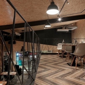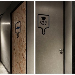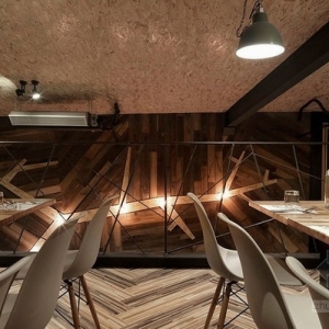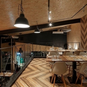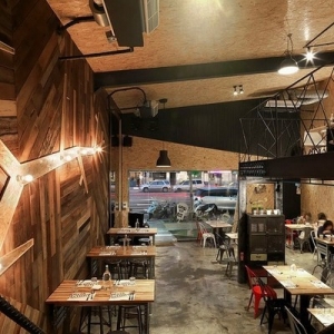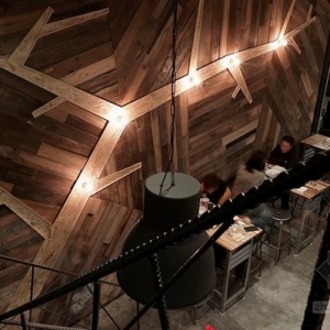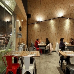 从这个店名可以看出,设计一直秉持着“工厂”精神,从店名起始到工业风格的向内延伸,铁件线性、钢筋楼梯扶手,甚至业主亲自寻觅而获的回收老木头,都是伴随着意式料理香的空间风景;坐立于硕大的挑高墙面前,老木纹理化为温润衬底,造型树枝开枝散叶出品牌茁壮与健康、再生谐趣,而小木屋般的暖度蔓延上天花,甘蔗板用材呼应着入口大胆切割而出的斜向几何,引人注目的味蕾工厂就此风格成形。